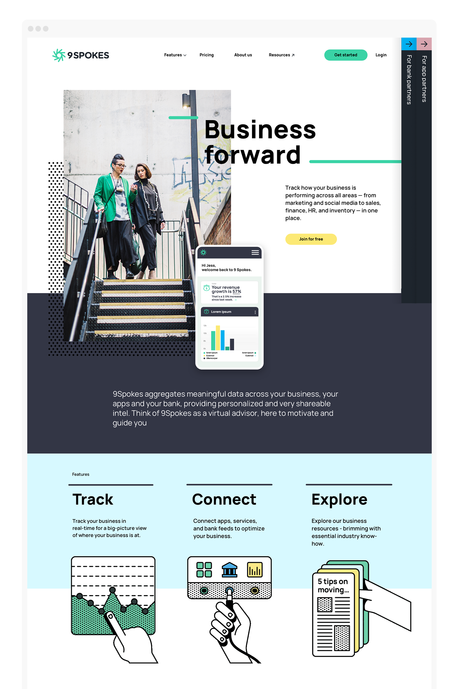 9Spokes is a business management app that aggregates data between small businesses, their apps & banks. It gives businesses highly personalised, sharable and meaningful insights to help steer them.