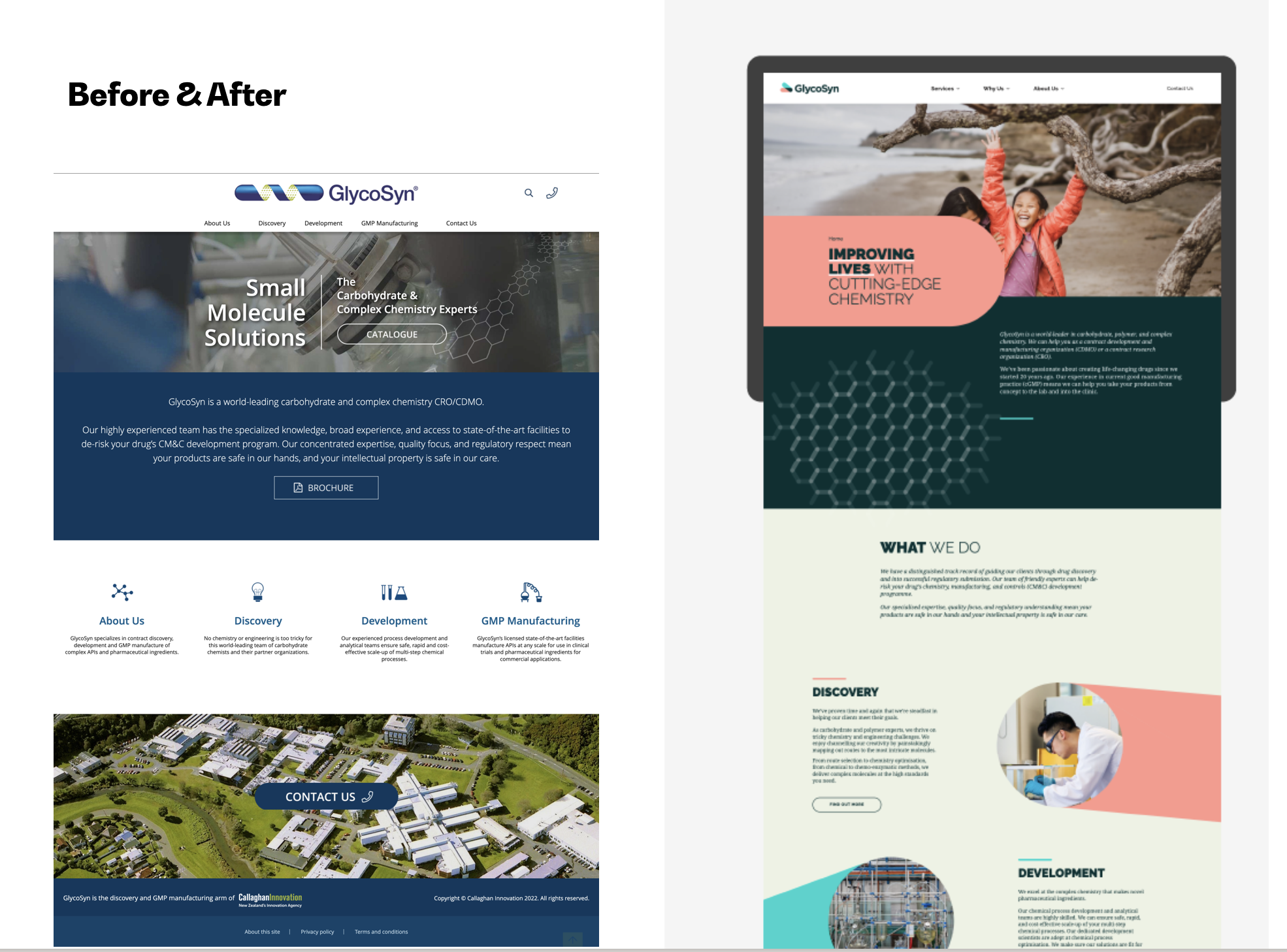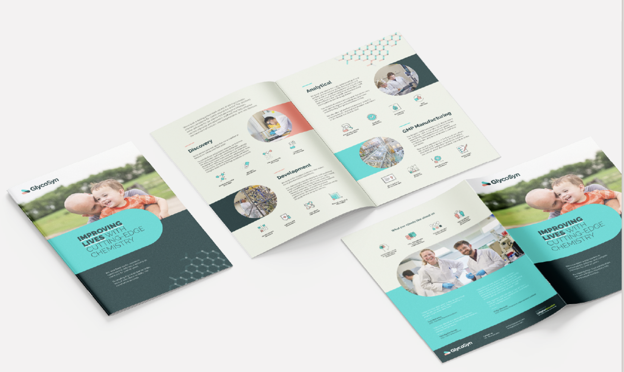As part of Salted Herring I worked through an in-depth research process with the wider GlycoSyn network of staff and clients globally to understand their business, its aspirations and their customers. Using a very collaborative process we developed a brand strategy and story that provides a clear and simple version of what is actually a very complex and technical process. The core idea of ‘improving lives with cutting-edge chemistry’ formed the basis of a strong new completely refreshed brand expression. This moved the brand away from dry, cliched imagery and convoluted technical language to simple but more aspirational messaging expressing why they do what they do. This is particularly helpful for their internal brand building; one of their brand goals is to help recruit and retain good people.